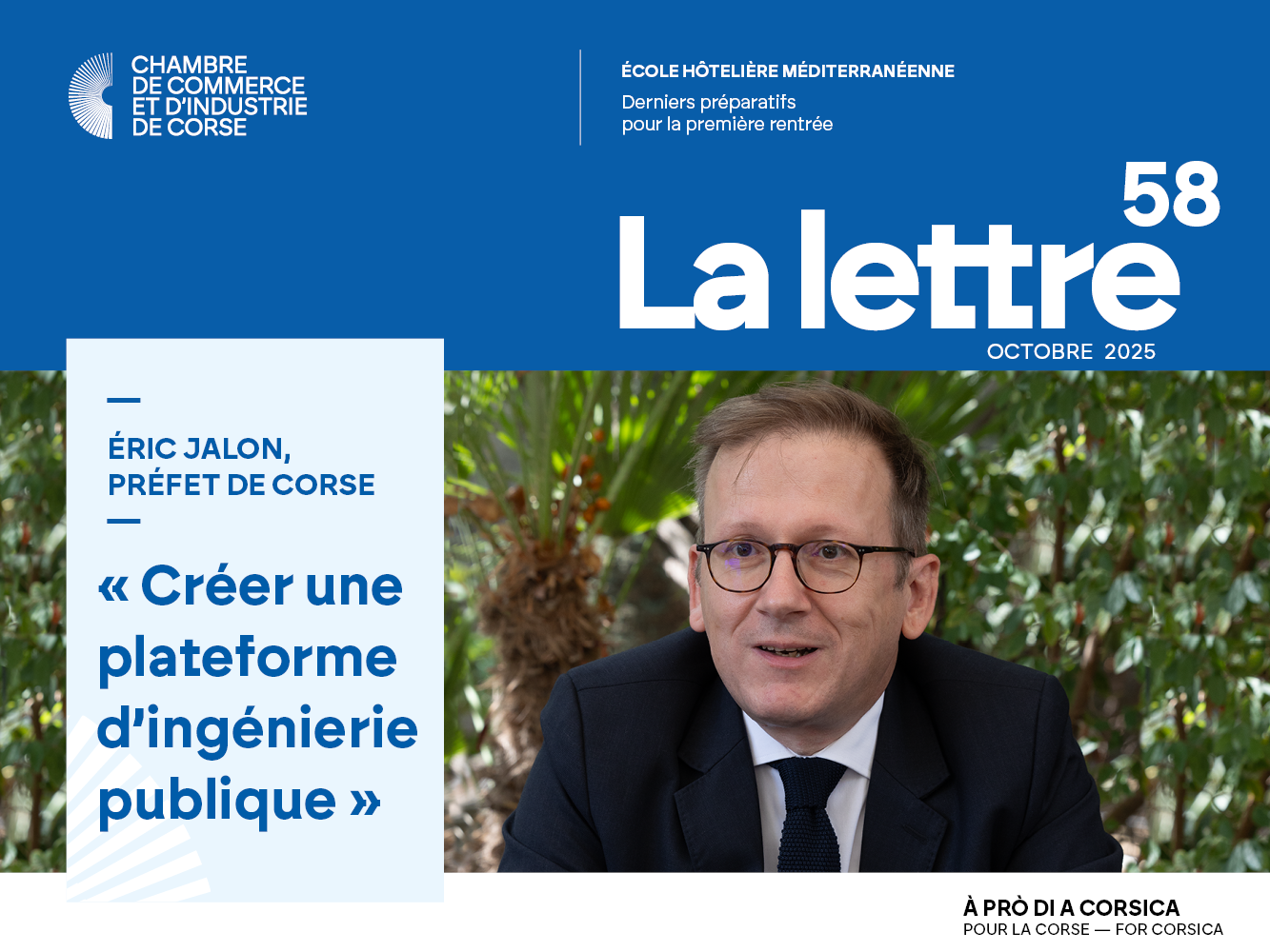 Notre édition du mois d’octobre porte un coup de projecteur sur l’École Hôtelière Méditerranéenne - EHM - qui ouvrira ses portes dans un mois au Palais des Congrès d’Ajaccio et sera inaugurée le 26 novembre prochain.